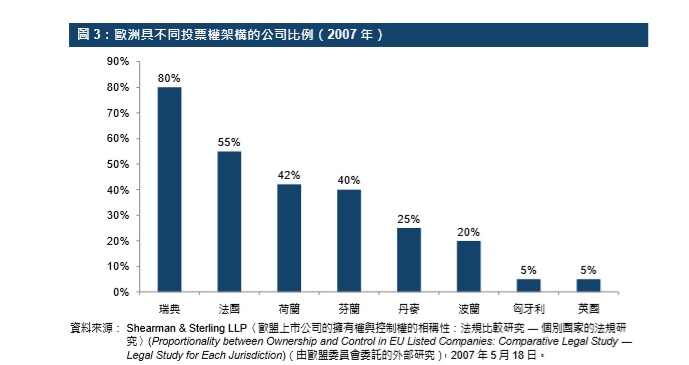 (2) 伦敦:英国市场仅接受不同投票权IPO根据“标准上市”的规则(即欧盟的最低要求)上市。要在伦敦证券交易所主板上市,“标准上市”的申请人仅须符合最低的欧盟协调标准,而“高级上市”的申请人则须遵守英国比欧盟最低要求更为严谨的“超等同”规则。“高级上市”的透明度较高,资金成本因而可能较低,不过“高级上市”的原则在2014年收紧了,投票权与股份持有量需成比例,亦即必须一股一票。、实证显示,2007年英国市场上有多重投票权的上市公司仅占5%。据一篇研究论文所解释,背后的原因有二:机构投资者的反对,以及收购规则移除了要约前的防御措施(例如透过采用双重股权架构),迫使公司遇到要约收购时只能采用一股一票制。