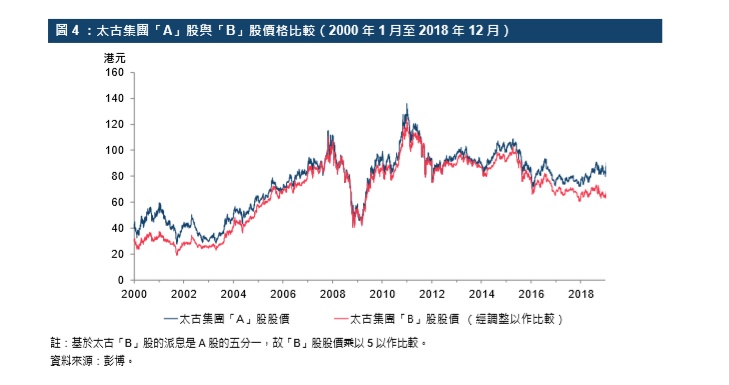 当时的上市规则并没有为发行这类股份的特定章节。发行“B”股时,公司原本的上市股份变成“A”股,“B”股则发行予原有股东。“B”股的每股投票权与“A”股相同,但面值较低(仅为“A”股的五分一或十分一),派息亦较低。控股股东可出售所持有的“A”股,并以较低价购入相同数目的“B”股来保持相同的投票权,以腾出更多现金抵抗收购行动。就太古集团而言,所发行“B”股的每股面值为每股“A”股面值的五分一(0.12港元相对0.60港元),派息亦按此等面值支付(即使股票须订面值的规定已于2014年香港修例后被废除)。若控制权受挑战,“B”股价格将相对“A”股出现溢价。然而于2000年至2018年间,在无人争夺控制权的情况下,太古“B”股经调整派息后的成交价较低,平均较“A”股折让12%,主要因为其流通量不高。