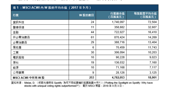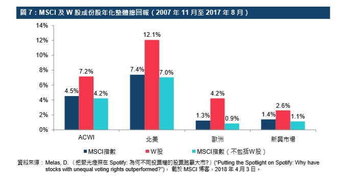 然而,一项研究发现,在全球及区域市场中,MSCI指数成分股中W股的长线平均回报均超过指数中的其他成份股。按2017年9月的数字,MSCI的全球基准指数ACWI共有2,493只成份股,当中243只为不同投票权公司的W股。2007年11月至2017年8月期间,MSCIACWI的W股成份股的年化总回报率为7.2%左右,比起指数整体回报的4.5%及一股一票成份股回报的约4.2%均要高。MSCIACWI的北美、欧洲和新兴市场区域指数中的W股成份股表现,亦跑赢指数整体回报及一股一票成份股的回报。W股在不同市场的超额回报各有不同。