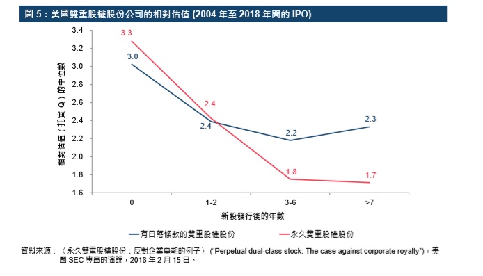 香港亦引入不同投票权架构自然日落条款以减少潜在的代理人利益冲突成本。日落条款为创办人提供合理时间,使其可投资于高风险项目创造长线价值,而要求不同投票权股份其后转为普通股亦属合理。在香港的制度下,不同投票权股份的不同投票权不设时间限制,而是遵从自然日落条款,即在受益人身故、或不再是董事、或不再被视为有行为能力可履行董事职责、或不再被视为符合董事的规定时,又或在不同投票权股份被转让之后,原有的不同投票权便不再有效。换言之,该等人士的继承人不能继承超级投票权。美国市场并没有要求双重股权架构有日落条款,但美国SEC专员RobertJackson提醒市场:“永久”的双重股权股份存在风险,因永久双重股权架构永久的存在,不仅惠及目光远大的创办人,也会惠及目光不一定远大的继承人。RobertJackson特别指出,永久双重股权股份的“相对估值”的中位数经过一段时间之后均见下降,但设有日落条款的,其相对估值的中位数在长线(上市后7年或以上)会略有改善。