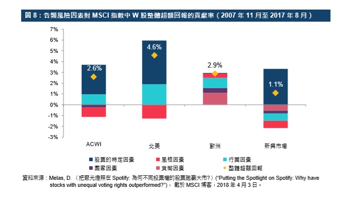 同一项研究又将MSCI指数中W股的超额回报拆解分析,将之分为源自不同风险因素的回报。行业因素带来正回报(MSCI新兴市场指数除外),这与过去十年科技业表现强劲吻合。其他主要风险因素(如货币、国家及市场因素)对跑赢大市的贡献却未见一致。相反,股票本身的特有风险在超额回报中的贡献程度较高(欧洲除外),该等风险可能包括创办人对创新产业的远见及其选择采用不同投票权架构。同一项研究还发现,与一股一票股份相比,W股成份股具有市值相对大、盈利能力较高但较不稳定、资产增长率较高但槓杆较低及股息较低的特征,这印证了不同投票权公司具远见的创办人会倾向投资于高风险项目,以尽量提升公司的长远价值。