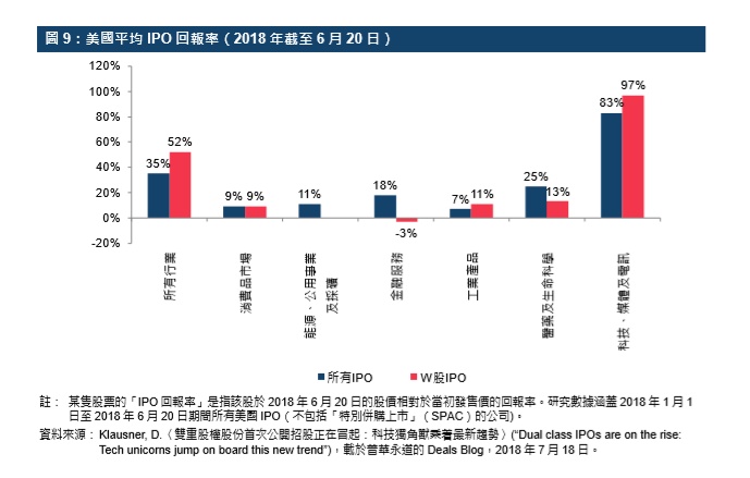 部分实证研究亦发现W股有超额回报。一项专题研究(以下简称“D&J研究”)对1978年至1998年间178家美国上市公司的双重股权资本重整进行研究(“双重股权资本重整”是指一股一票公司重整为不同投票权公司并将其一类有限投票权或无投票权的普通股上市),估算到买入并持有该等公司既有的一股一票股份在其宣布进行资本重整后首年及第四年,与没进行双重股权资本重整的配对样本比较下所获得的超额回报率分别为5%及23%。另一项实证研究发现美国2018年上半年的W股IPO回报较市场平均为高——于研究期间,美国W股IPO的平均回报率(自发售日期起计)高于所有IPO的平回报率。行业方面,科技、媒体及电讯(TMT)行业的W股的平均回报率优于业内所有IPO的平均回报率;而当中的TMT行业的IPO平均回报率于2018年上半年亦是所有行业中最高者,显示创新科技产业公司的W股相当受投资者欢迎。