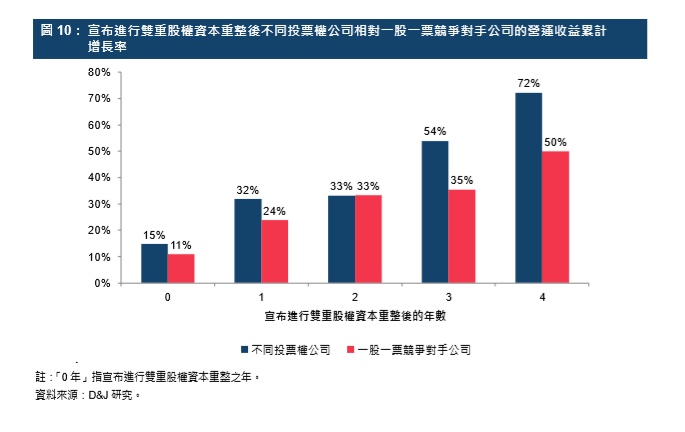 第3.1节引述的D&J研究结果显示美国不同投票权公司的收入增长及盈利能力优于其属于非不同投票权公司的竞争对手——美国不同投票权公司在销售、资产及营运收益方面的增长较业内规模相近的竞争对手为高。尤值得注意的是,不同投票权公司在宣布进行双重股权资本重整后四年内的营运收益上升了72%,而竞争对手则只上升了50%。盈利能力方面,不同投票权公司与竞争对手的资产回报率并无差异,但资本重整后数年间不同投票权公司的股本回报却较高。