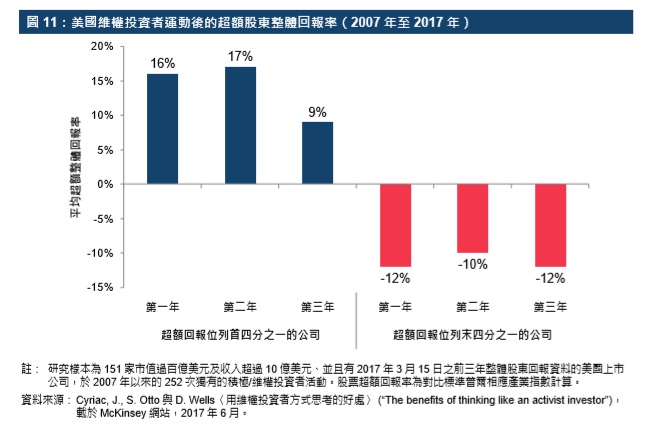 不同投票权架构亦可避免因为长期与短期投资者之间的潜在冲突而产生的委讬人利益冲突成本。有些短期投资者(如维权投资者)或倾向于对其投资的公司行使控制权,但研究发现维权投资者的行为不一定能提升公司价值。根据McKinsey的一篇文章,针对美国公司进行的维权投资者运动的次数从2010年的108次增至2016年的280次。文章特别指出,TMT产业的维权投资者大多是缺乏相关产业专业知识的一般人士。维权投资者虽有意创造价值,其进行的活动却不一定能提高对股东的整体回报率(“整体回报率”是指按公司营运表现、股票市值及市场对公司表现及财务槓杆所预期的转变而作出的整体量标50)。超额的股东整体回报率(相对于相应的标准普尔产业指数的股东整体回报率)在维权投资者运动后首三年内可为正数或负数。