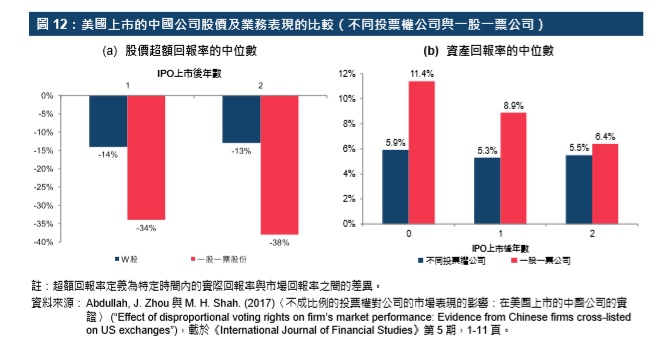 基于公司文化或有不同,中国的不同投票权公司的情况与国际经验比较可会是相同或有异?部分实证显示,就股价及业务表现而言,于美国上市的中国W股表现没有跑输一股一票公司的股份(“一股一票股份”)。一项研究分析了在美国的证券交易所上市的33家中国双重股权公司及88家在中国单一股权公司。就价格表现而言,于美国上市的中国W股在熊市表现下滑的程度较低——W股在IPO上市后第二年超额回报的中位数下跌13%,一股一票股份的中位数则下跌38%(见图12a)。不同投票权公司及一股一票公司的市盈率及托宾Q比率并无重大差异。业务表现方面,不同投票权公司及一股一票公司在IPO上市后第二年的资产回报率的中位数并无统计学上的显着差异。