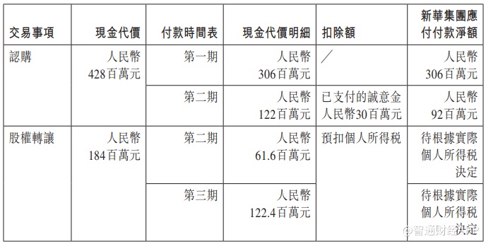 该公司此次交易通过现金和股份支付,其中现金支付6.12亿元,分别支付给富达公司4.28亿元及苏先生1.84亿元,并分三期支付,另外向苏先生或其指定人士以发行价4港元(较公告日前一交易日股价溢价50.4%)增发3.06亿元等值的股份。