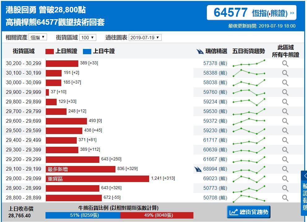 智通财经APP获悉,截至7月19日,恒指最新的牛熊街货比例51:49。瑞信恒指牛熊证街货分布图中的数据显示,熊证街货重货区在29000-29099区间,该区间最新熊证数量为1241张,较上一交易日增加313张;最多新增区间在29100-29199区间。牛证街货重货区在27700-27799区间,该区间最新牛证数量为852张,比上一交易日减少108张;最多新增区间在28300-28399区间。