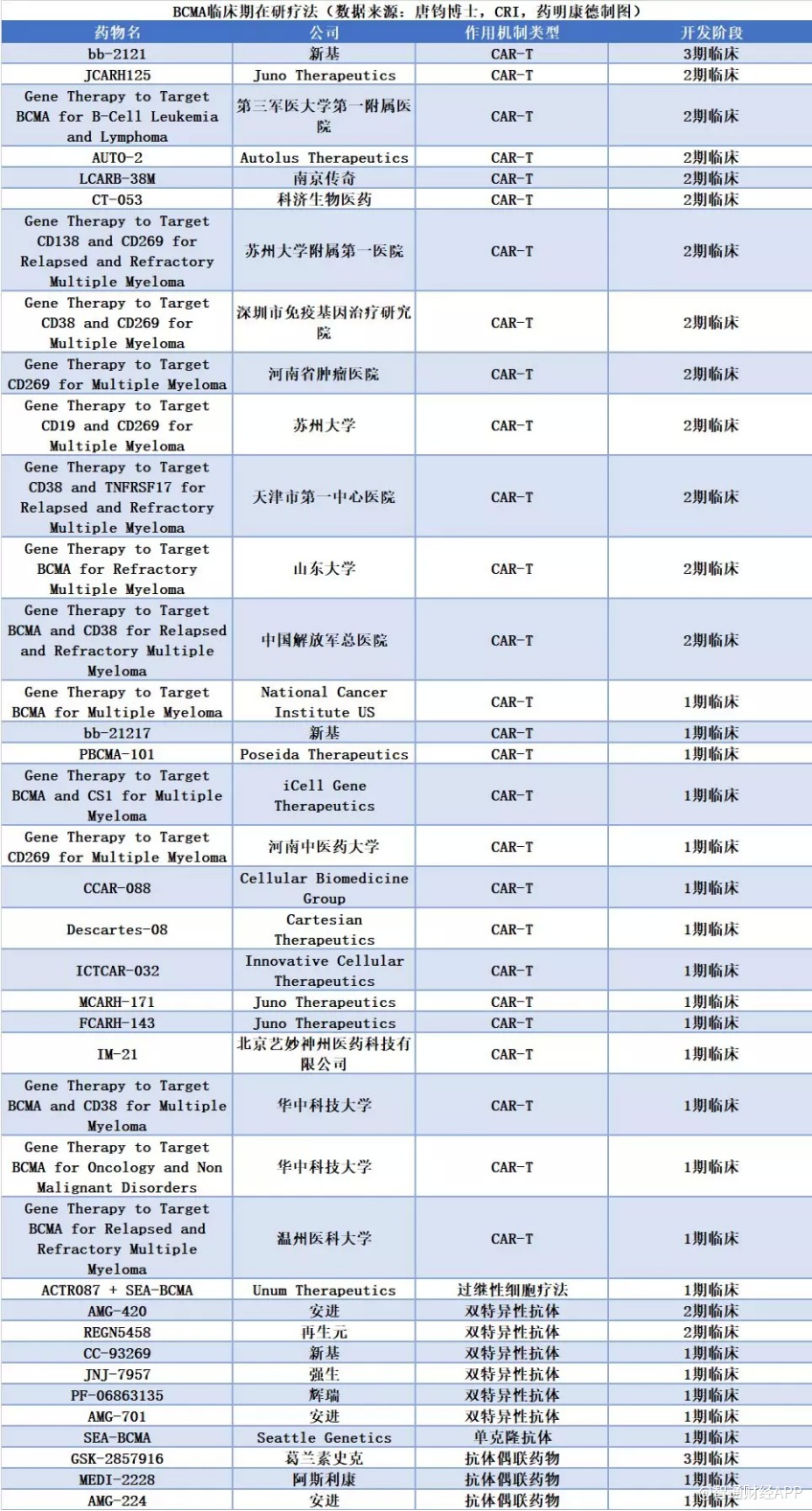其中,新基和bluebird bio联合开发的bb-2121已经进入3期临床阶段,新基公司计划在2020年为这款CAR-T疗法递交监管申请。若获批上市,bb-2121或将成为首款获批的靶向BCMA的CAR-T细胞疗法。