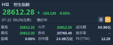 智通财经APP获悉,恒生指数开盘跌153.12点或0.53%,报28612.28点。国企指数跌0.41%,报10864.58点。红筹指数跌0.2%,报4445.48点。大市盘前成交30.99亿港元。科创板今日鸣锣开市。