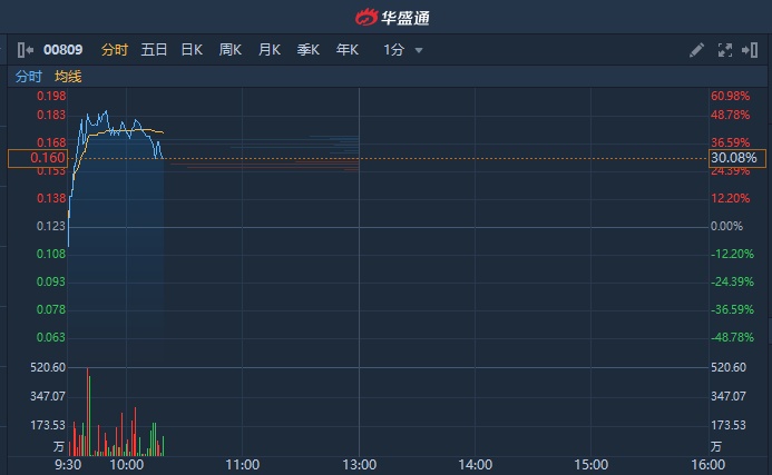 大成生化科技(00809)今日复牌,早盘跳空大幅高开后继续拉升,盘中曾创52周新高0.19港元。截至10时18分,涨幅收窄至30.08%,报0.16港元,成交额达897.8万港元。