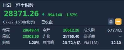 智通财经APP获悉,恒指低开153.12点或0.53%,报28612.28点。截至收盘,恒生指数跌394.14点或1.37%,报28371.26点,全日成交额达677.5亿。国企指数跌1.28%,报10770.31点,红筹指数跌1.28%,报4397.43点。