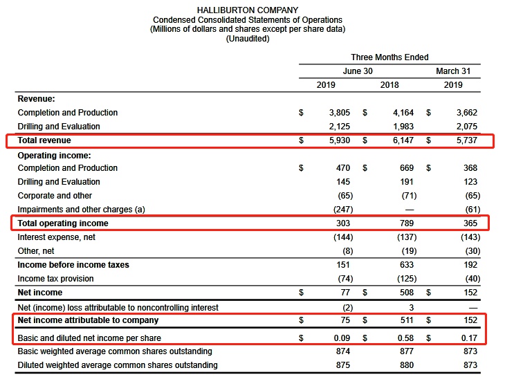 智通财经APP获悉,7月22日,哈里伯顿公司(HAL.US)公布2019年第二季度财务报告,其中净利润为7500万美元,摊薄后每股收益为0.09美元;按Non-GAAP计算,调整后每股收益0.35美元,超出市场预期;总收入为59.3亿美元,稍逊于市场预期。