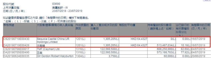 港交所披露显示,7月16日红杉资本旗下的Sequoia Capital China UR Holdings Limited以每股64.43港元的均价减持美团点评(减持原因尚未披露),但截至当日,沈南鹏仍持有513,487,034股好仓,持股比例为10.18%,并非媒体所言的“持股比例从10%降至0%”。