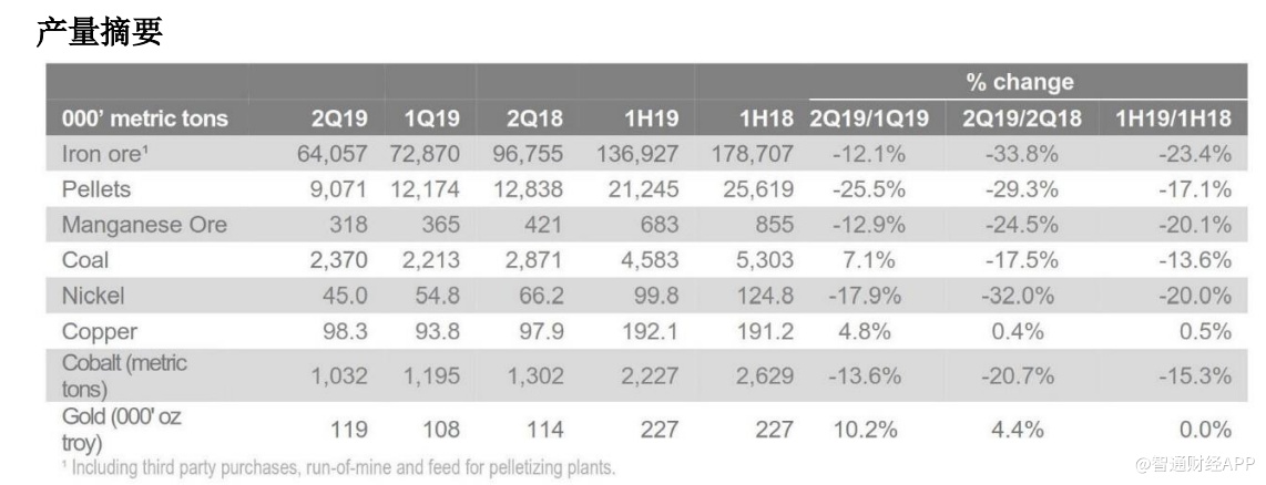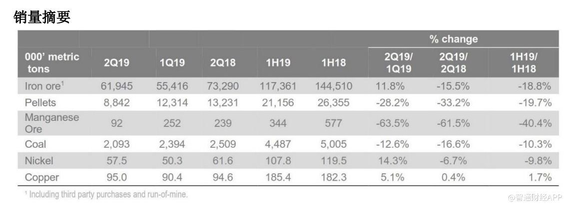 本季度铁矿粉和球团矿的销量为 7080 万吨,环比增长 4.5%,但同比下降 18.2%; 镍销量为 5.75 万吨,环比增长 14.3%。 2019 年第二季度,特优产品占总销量的比例增长至 86%。