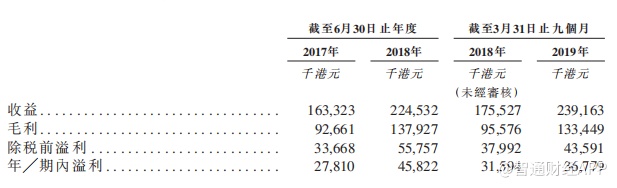 招股书显示,截至2017年及2018年6月30日止两个年度及2019年3月31日止九个月的收益分别约为163.3百万港元、224.5百万港元及239.2百万港元。