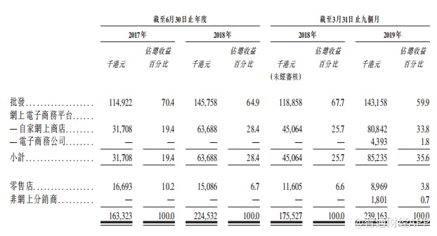招股书显示,截至2017年及2018年6月30日止年度及2019年3月 31日止九个月,来自批发客户所产生的收益分别占该公司总收益约70.4%、64.9%及 59.9%。截至最后实际可行日期,该公司也通过零售店(包括两间Canmake自租店、一间Bou Eki自租店、一个Canmake专柜及一个Bou Eki专柜)直接向香港的消费者出售其产品。