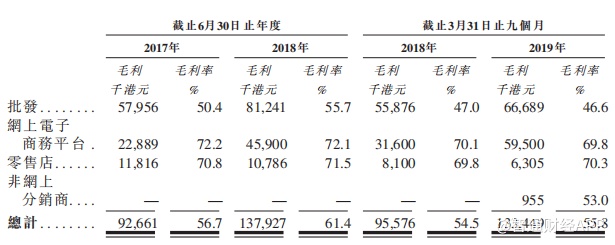 其中,截至2018年3月31日止九个月的批发渠道毛利率约为47.0%,轻微下降至截至2019年3月31日止九个月的46.6%。该等下降由于我们为批发客户提供进一步的价格折扣, 以透过批发渠道维持及提升我们的市场份额。