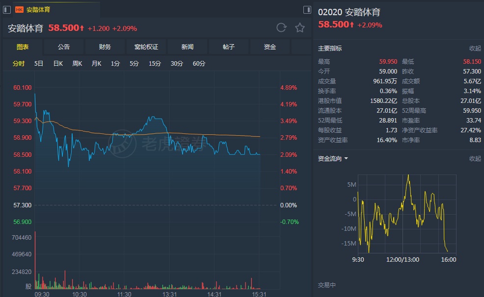 智通财经APP获悉,高盛发表研究报告表示,预计安踏体育(02020)2020至2021年度市盈率分别为20及23倍,该行上调公司目标价至67.2港元,继续给予“买入”投资评级,但要留意公司Amer Sports 销售贡献低于预期、FILA销售增长疲弱等风险。