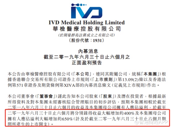 在目前医疗器械的细分赛道中,最亮眼的莫过于体外诊断板块。因此作为稀缺的“港股IVD第一股”,华检医疗自然受到资本的青睐。智通财经APP了解到,近日,华检医疗(01931)发布公告称,公司在2019年中期净利润同比暴涨650%。受业绩利好刺激,其股价在7月17日收涨14.74%。
