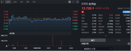 截至今日收盘,新秀丽(01910)涨0.13%,报15.72港元。
