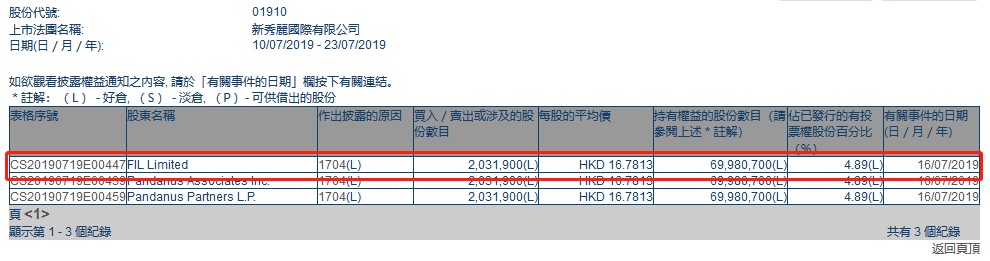 智通财经APP获悉,联交所最新资料显示,7月16日,富达国际对新秀丽(01910)减持203.19万股,每股平均价16.7813港元,涉及总金额约为3409.79万港元。减持后富达国际最新持股数目约为6998万股,最新持股比例为4.89%。