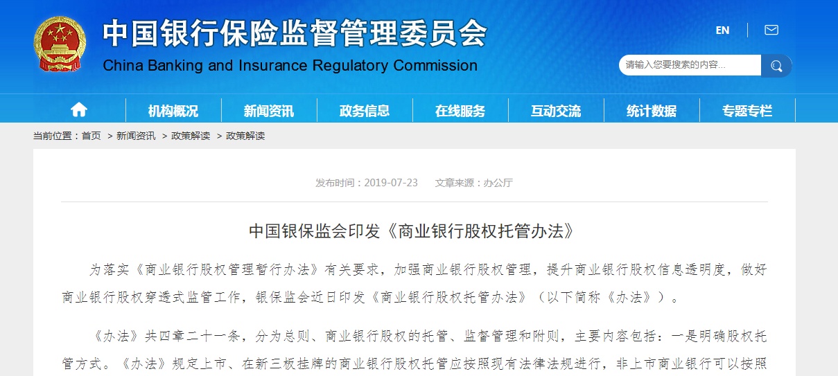 中国银保监会印发《商业银行股权托管办法》