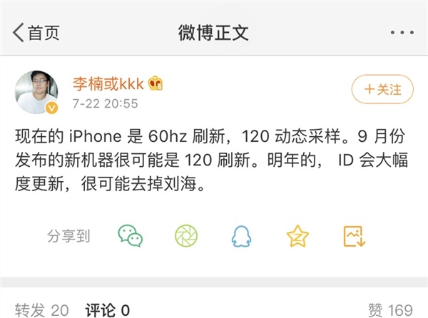 智通财经APP获悉,7月23日消息,昨日,魅族前高级副总裁李楠在微博发布爆料称,“现在的iPhone是60Hz刷新,120Hz动态采样,9月份发布的新机器很可能是120Hz刷新。至于明年,ID会大幅度更新,很可能去掉刘海。”但是目前,该微博已被删除,不知出于何种原因。