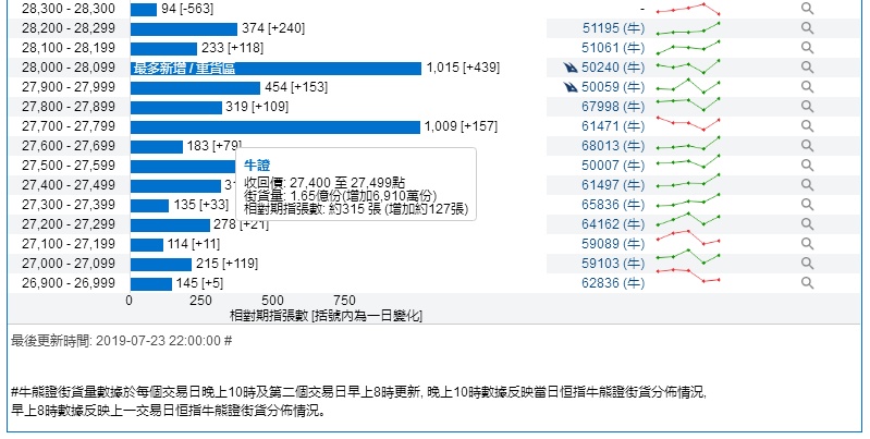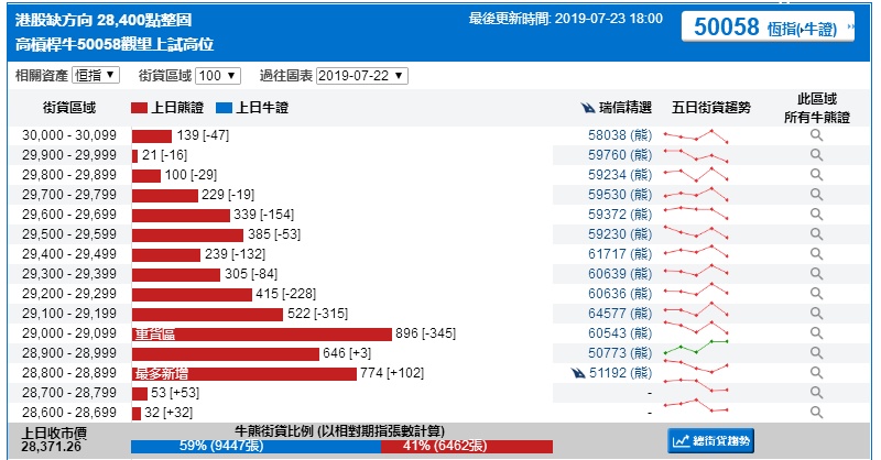 智通财经APP获悉,截至7月23日,恒指最新的牛熊街货比例59:41。瑞信恒指牛熊证街货分布图中的数据显示,熊证街货重货区在29000-29099区间,该区间最新熊证数量为896张,较上一交易日减少345张;最多新增区间在28800-28899区间。牛证街货重货区在28800-28099区间,该区间最新牛证数量为1015张,比上一交易日增加439张;最多新增区间在同一区间。