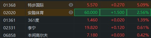 智通财经APP获悉,体育用品股早盘延续强势,个股集体上扬,截至发稿,特步(01368)升5.09%领涨,安踏(02020)涨2.56%,盘中再创上市新高60.5港元,361度(01361)涨1.39%。