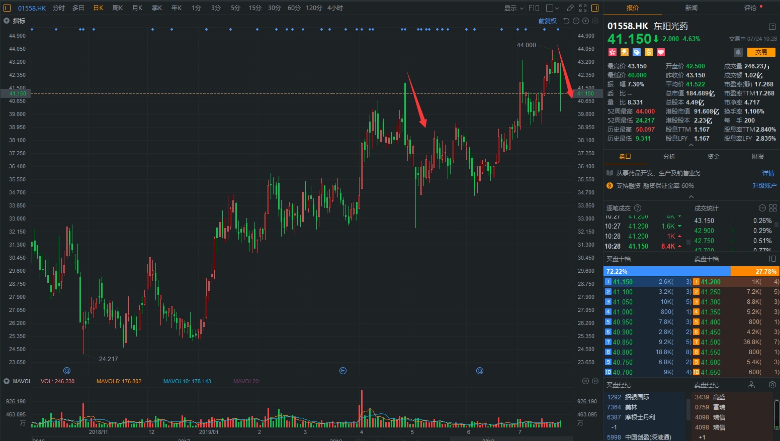 不低于60%的增长,换做其他票早就高开5个点了,可奈何东阳光药低开不说,半小时内最低跌破7个点,报40港元。