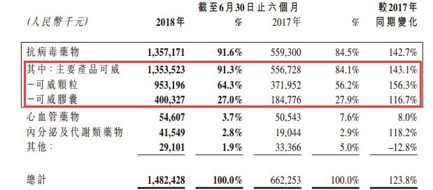 抗病毒药物销售额如此疯狂拉升,主要是得益于核心产品可威系列的快速增长,2012-2017年间复合增长率高达173.3%。至2017年,可威系列销售额占抗病毒药物销售额的99.5%,占总营收的87.5%。要知道,2016年可威总销量还未突破8亿元。