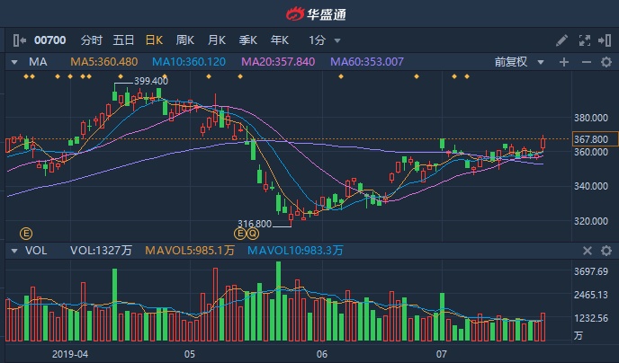 值得一提的还有,高盛昨日发表报告称,腾讯将在下月14日公布第二季业绩,预期腾讯的手游收入按年增加23%(主要受惠版号审批及期内多个新游戏推出),维持“买入”投资评级,维持目标价418元。