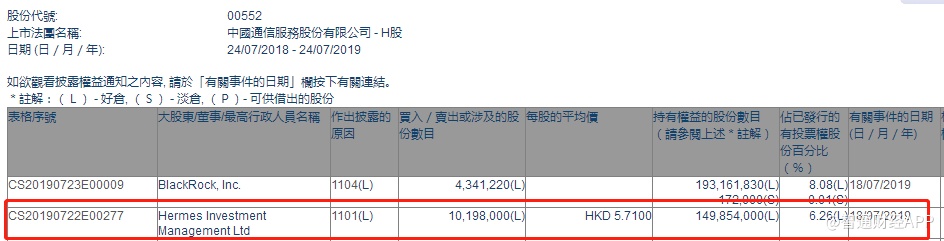 智通财经APP获悉,根据联交所资料显示,Hermes Investment Management Ltd于7月18日增持中国通信服务(00552)1019.8万股,每股作价5.71港元,总值约5823.06万港元,最新持股数目1.50亿股,最新持股比例为6.26%。