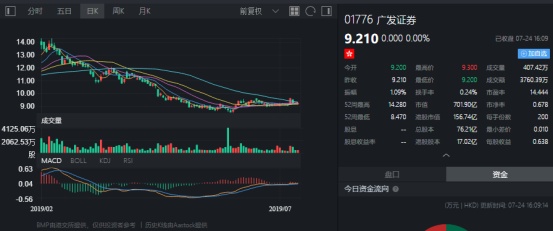 截至今日收盘,广发证券(01776)无涨跌,报9.210港元。
