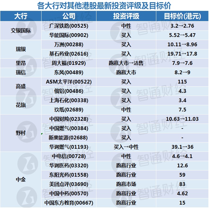 三,各大行对其他港股最新投资评级及目标价: