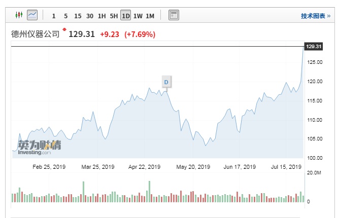 智通财经APP获悉,周三美股开盘,德州仪器(TXN.US)大涨7.69%,报129.31美元,股价创历史新高。该公司在此前发布财报显示,第二季度净利润为13.1亿美元,合每股收益1.36美元,高于市场预期的1.22美元。