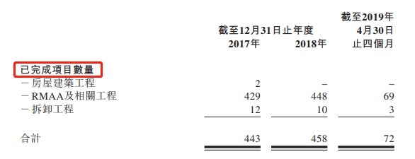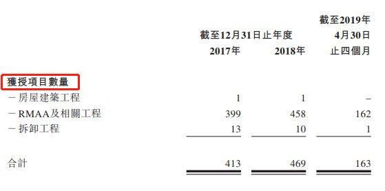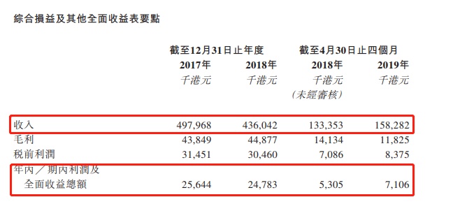 截至2017年、2018年12月31日止两个年度,该公司营收由约4.98亿港元减至约4.36亿港元,减少12.4%,该减少主因房屋建筑工程收入减少约1.33亿港元。截至2018年、2019年4月30日止四个月该公司收入由约1.33亿港元增至截至约1.58亿港元,增加18.7%,该增加主因房屋建筑工程收入增加约5010万港元影响所致。
