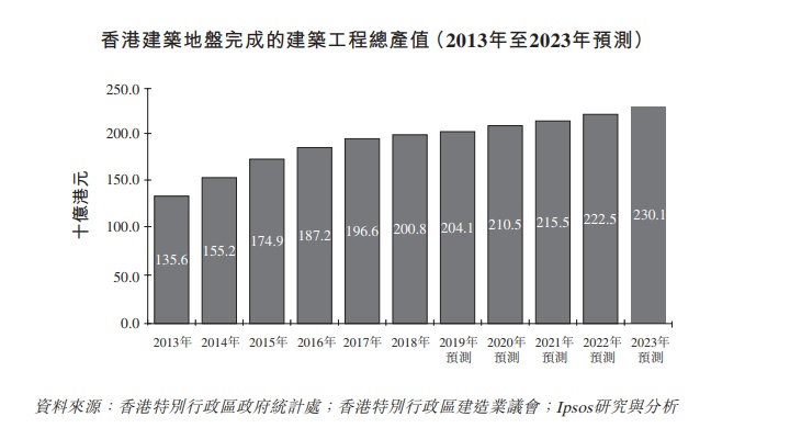 市场及竞争:根据Ipsos报告,香港整体建筑工程总产值由2013年约1356亿港元增至2018年约2008亿港元,年复合增长率约为8.2%。显着增长主因商业及住宅需求上升、工业楼房翻新及活化,以及进行公营房屋发展计划及启德发展计划等大型公共基建项目。在竞争环境方面,房屋建筑工程、RMAA工程及拆卸工程分部的竞争均相对分散。