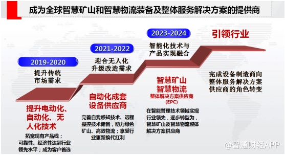 未来公司计划把电动技术、无人技术、远程操控技术逐步与更多矿山及物流产品相互结合,逐步完成公司产品向上述智能化的转型,这些改变会让公司在存量市场的升级改造及新增市场需求两方面综合受益。