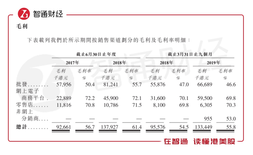 而从公司销售渠道来看,批发客户为公司最主要的收入来源。2018财年来自批发渠道的收入占比为64.9%。然而,批发为公司目前毛利率最低的渠道,且呈逐年下降趋势。除此之外,公司零售店所占份额逐年减少,截至2017、2018财年及2019年3月31日,零售店所贡献收入占比分别为10.2%、6.7%、3.8%。
