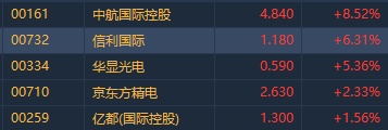 智通财经APP获悉,OLED概念股盘中发力,截至发稿,中航国际控股(00161)涨8.74%,信利国际(00732)涨6.31%,华显光电(00334)涨5.36%,京东方精电(00710)涨2.33%,亿都(国际控股)(00259)涨1.56%。