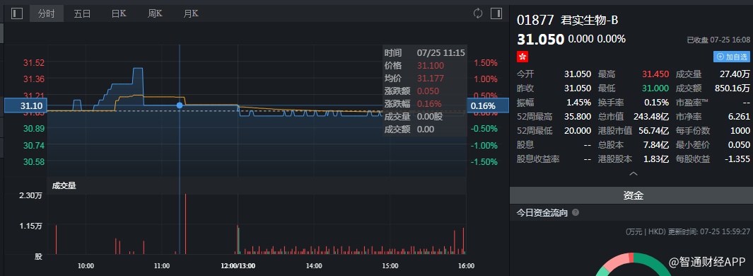 截至今日收盘,君实生物-B(01877)无涨跌,报31.05港元。