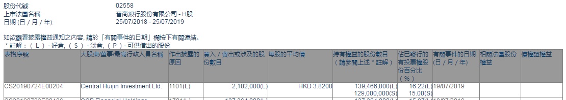 智通财经APP获悉,根据联交所资料显示,Central Huijin Investment于7月19日增持晋商银行(02558)210.2万股,每股作价3.82港元,总价值约802.96万港元,最新持股数增至约1.39亿股,最新持股比例16.22%。