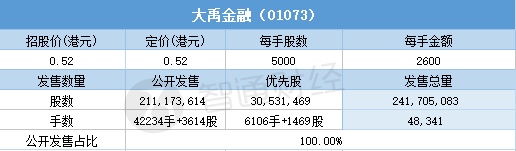 智通财经APP获悉,7月25日,大禹金融(01073)配售结束。配售招股价0.52港元,最终定价0.52港元,每手2600港元。