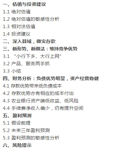 对公司未来盈利预测的不确定性因素主要来自两部分:一是由于市场利率变动频繁,加上银行自身也会根据市场利率波动调整其资产负债的类别、期限等配置,尤其是农业银行资产负债表中有相当大比例的利率敏感性资产和负债,更加剧了市场利率波动的影响;二是对于不良贷款的认定和相应的拨备计提,银行自身主观调节空间较大,因此可能导致实际情况与我们假设情况差别较大。