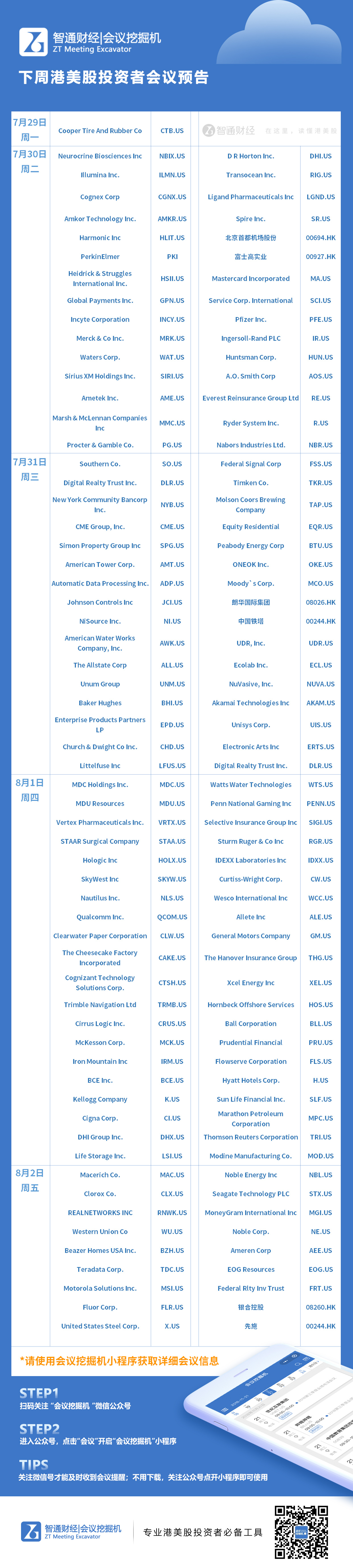 以下是智通财经“会议挖掘机”为您整理的下周(7月29日-8月2日)港美股上市公司会议日历。