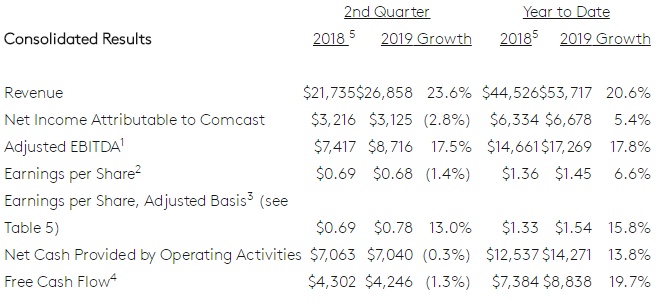 康卡斯特公司董事长兼首席执行官Brian L. Roberts表示:“我对公司第二季度的出色业绩以及我们战略的持续成功执行感到满意。我们的每一项业务经调整后的息税折旧摊销前利润(EBITDA)均呈现健康增长,推动调整后的每股收益实现两位数增长。公司持续盈利的增长得益于我们在直接客户关系和优质内容方面的领先规模。康卡斯特现在拥有近5500万高价值直接客户关系,其中包括第二季度新增的45.6万名客户,以及一个庞大的知识产权和新产品库。我对公司未来的增长机会感到兴奋,目前公司正在努力制定流媒体计划,计划在明年4月份推出这项服务。”