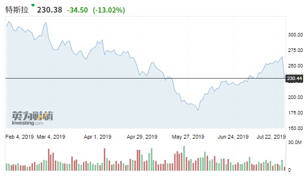 智通财经APP获悉,7月25日美股开盘后,特斯拉(TSLA.US)大跌13.02%,报230.38美元,因其Q2营收和每股收益均低于市场预期。