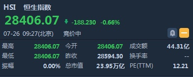 智通财经APP获悉,恒生指数开盘跌188.23点或0.66%,报28406.07点。国企指数跌0.74%,报10849.4点。红筹指数跌0.24%,报4434.76点。大市盘前成交44.32亿港元。