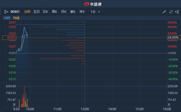 智通财经APP获悉,细价股侨雄国际(00381)早盘获强力拉升,涨幅一度达40%,截至发稿涨幅收窄至24%,报0.031港元,成交额达503万港元。